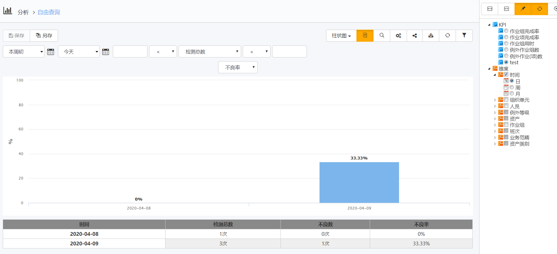 根据作业组属性检测结果的值分析出检测总数、不良数、不良率