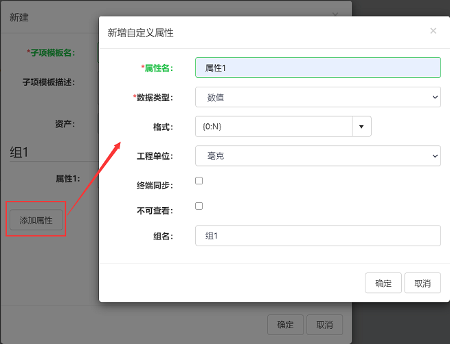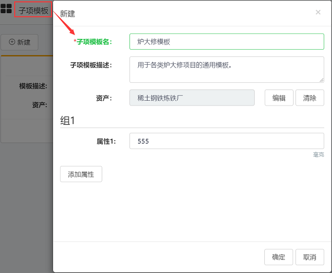 点击新建,填写相应信息,子项模板名必填,子项模板描述的数据类型为字符串,这里若选择了关联某个资产,那么子项模板中添加的子项关联的资产范围将自动变为该资产及其所有子级。同时,可以为子项模板添加自定义的属性。新建完成点击确定即可。