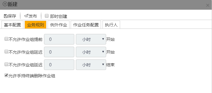 - 不允许作业组提前开始,作业组不可以在计划开始时间前提前开始执行。可以设定一个时间段,早于计划开始时间至这个时间段,作业组在手持终端上是不可见的。