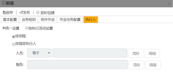 按制定执行人,勾选按指定执行人后,可以选用两种配置方式,人员选择等于(不等于)某个指定的人员(不等于这个人员的所有其他人)。角色指定为某个岗位或者部门中的所有人。