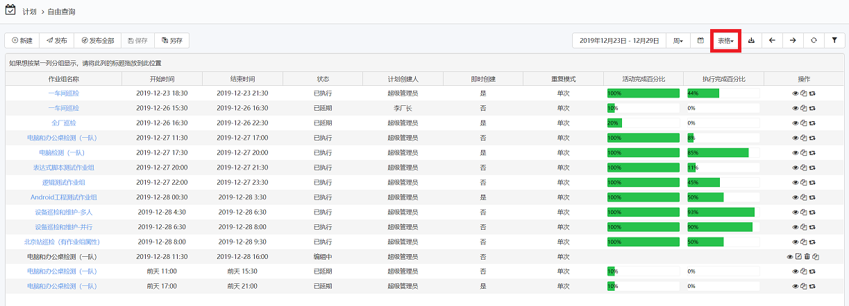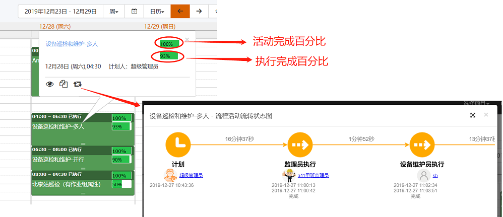 计划视图中,可以看到活动完成百分比和执行完成百分比的显示,同时当计划被创建后,可查看流程活动流转状态图。