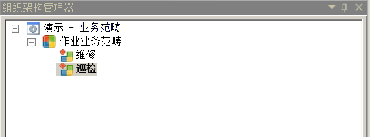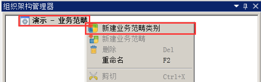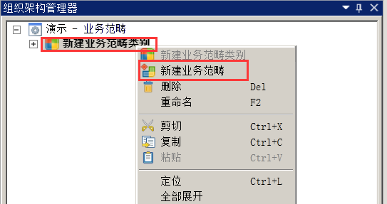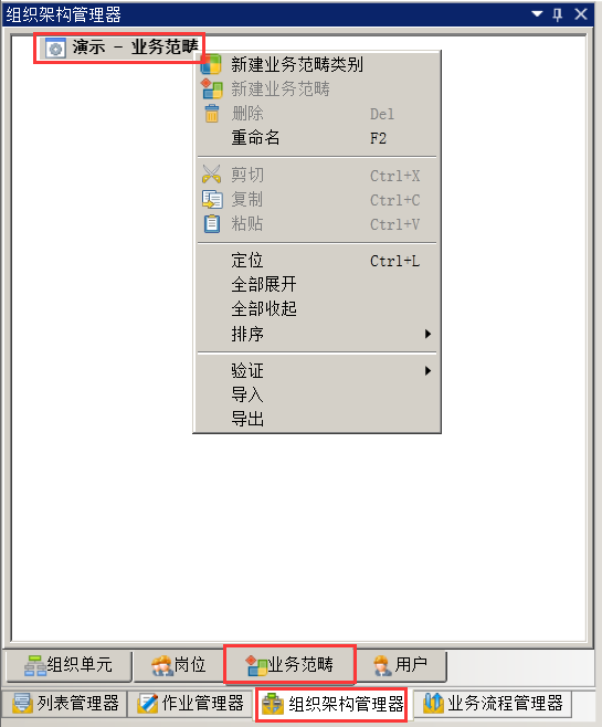 在导航栏→组织架构管理器→业务范畴内右键演示-业务范畴,在快捷菜单中即可完成业务范畴的新建业务范畴类别、新建业务范畴、删除、重命名、剪切、复制、粘贴、全部展开、全部收起、排序、验证、导入和导出操作