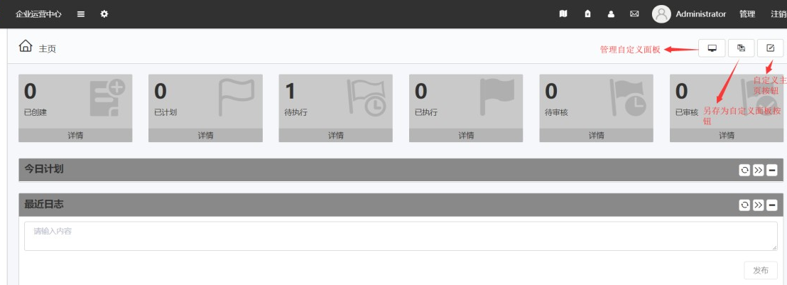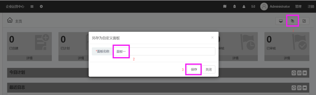 • 打开 Eoc(企业运营管理中心)网站,可以根据自己的需要先设置好自定义主页界面然后另存为自定义面板,或者不编辑主页直接先另存一个自定义面板,然后再对改自定义面板进行编辑。如图