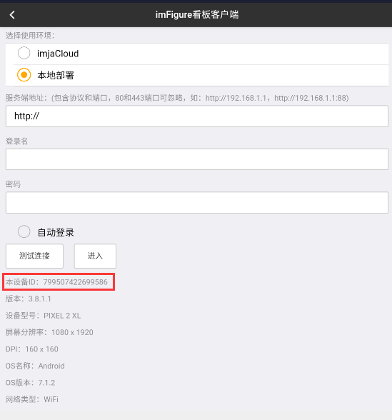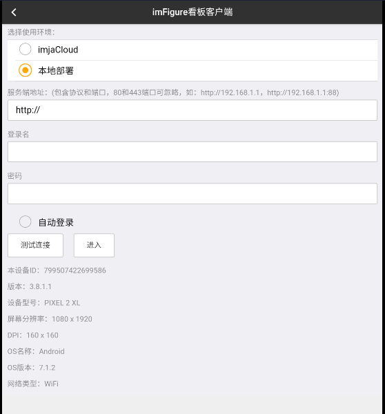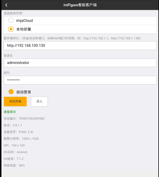 • 以上配置完成后,再次在大屏终端打开安装好的 imFigure 应用程序,点击测试连接按钮,如果显示连接成功,则面板授权成功,接着可以点击进入按钮, 则可以输入用户密码登录到面板界面,如配置正确,则会显示您配置好的自定义面板页面,如果显示错误,则需要检查配置文件【config.json】是否正确。如图: