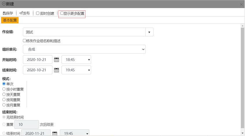创建计划默认隐藏配置,适用于创建计划页面,对于新建窗口功能的显示。勾选想要隐藏的项后保存即可生效。除administrator外的用户,如果没有进行任何配置,会显示为administrator配置的结果,如果进行了配置,则显示的结果为自身个性配置的结果,如果临时需要被隐藏的功能,点击显示更多配置可以将隐藏项都显示出来