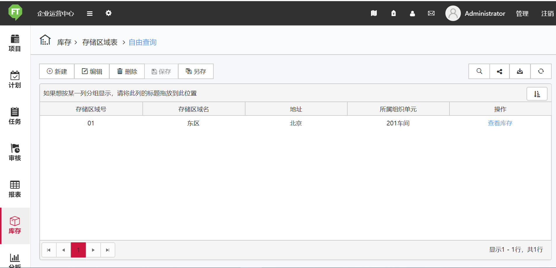 • 库存区域是库存所在,其概要信息包括了存储区域号(不可重复)、存储区域名、地址以及所属组织单元。同时,提供查看库存操作。编辑页面可编辑所有的相关信息。