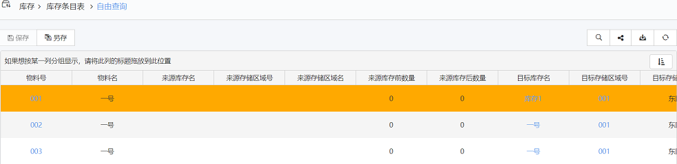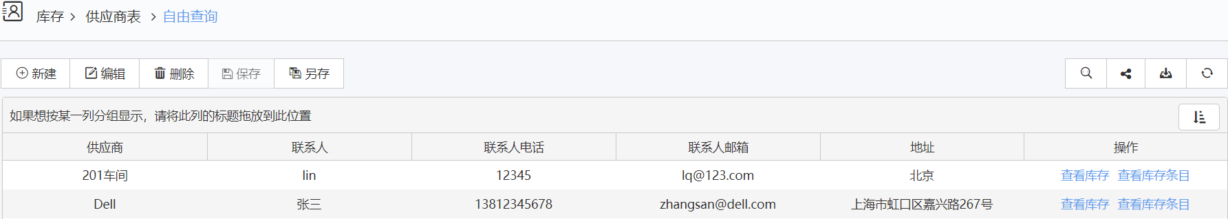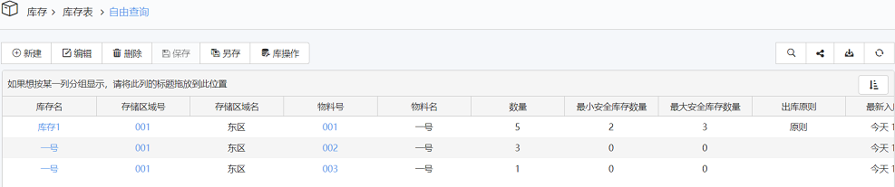 • 库存表列出了当前库存的所有详细信息,包含了存储区域、物料、供应商的相关信息,库存表将这三个表中的信息整合对应起来,形成一种库存。