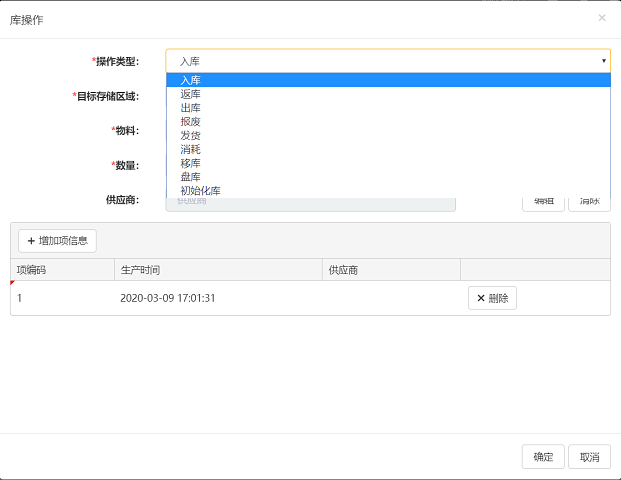 • 针对于当前库存进行相应的操作,基础操作为选择操作类型、目标存储区域、物料、数量以及供应商;同时可增删改该库存的项信息,为项信息填写编码、生成时间和供应商。