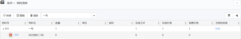 • 物料清单列出了物料相关的详细登记的单子。在新建和编辑时要注意物料号不能与已有物料重复。