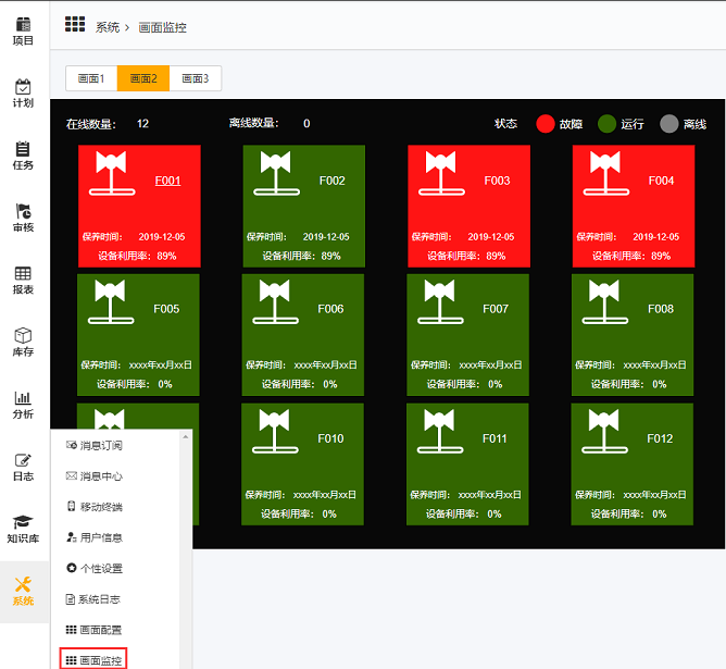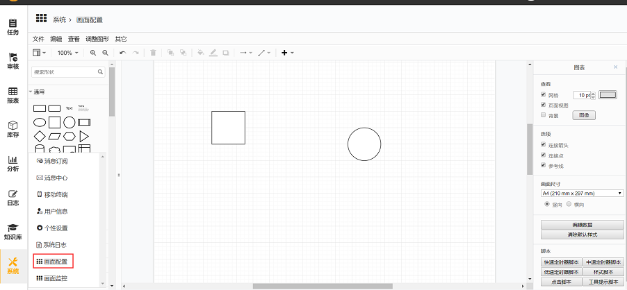 画面配置页面可以对监控画面进行自由定制,通过组合编辑各类图形完成配置,可以对诸如人员资产等实体的属性状态进行监控。