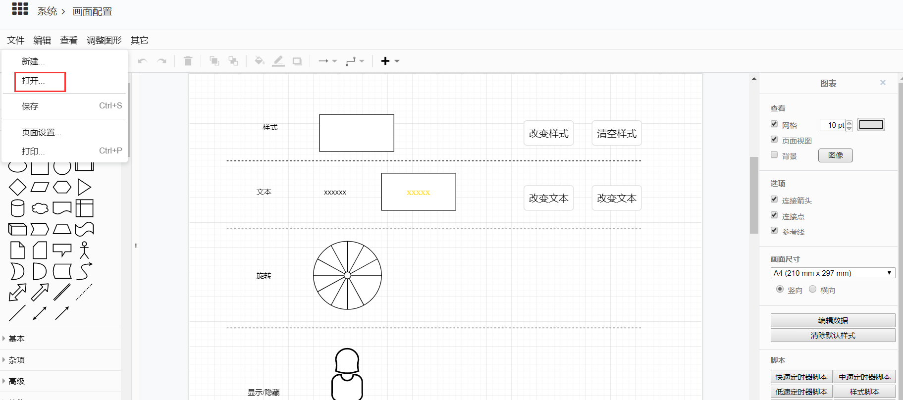 • 文件:包括新建一个画面文件,打开已保存画面,保存配置,设置页面的尺寸、背景和图像,打印等。