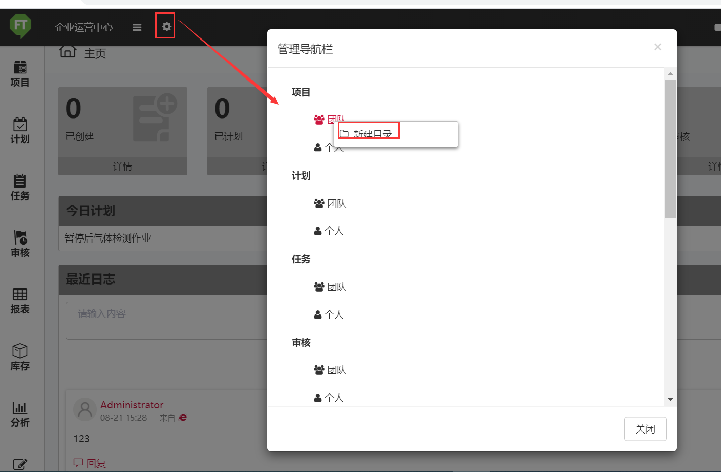 企业运营中心左侧为导航栏,用户可以对各项功能进行操作。也可以通过管理导航栏,来为各功能新建目录,对新建目录的编辑和删除也在管理导航栏中。
