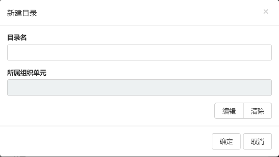 新建目录窗口,包含目录名和选择所属组织单元(可不选)功能,选择所属组织单元后,只有该组织单元的角色登录时在管理导航栏才可见和编辑该目录。