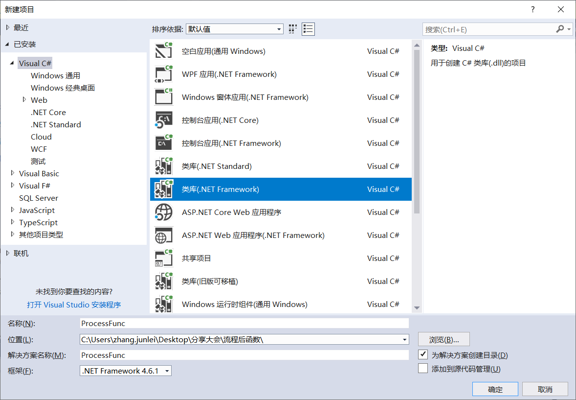 ProcessFunc(名称可修改),选择类库(.NET Framework),框架选择.NET Framework 4.6.1