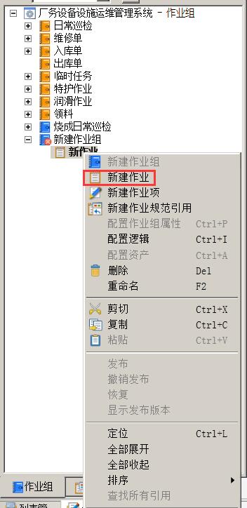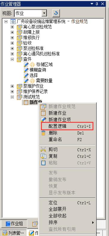 作业是作业组的子结点,它代表了针对某个资产(设备或区域)的现场作业内容。作业可以嵌套作业,也就是说,作业允许有其子作业。作业的执行可以由一系列业务规则来控制。配置好的作业将在手持终端上执行。