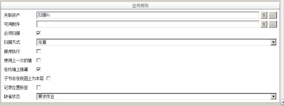 必须扫描 - 该作业必须扫描,才能对其以及其下所有子作业和作业项进行操作。该项业务规则将影响到其在手持终端上的执行。如果没有扫描,该作业下的所有子作业和作业项均是无效的。只有关联了资产并且该关联资产是扫描点,这个配置才是有效的。