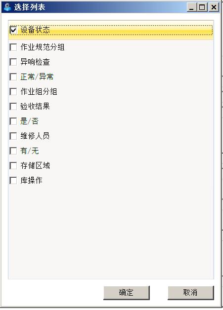 启用状态检查 - 是否该作业启用状态检查。状态是针对作业的特殊变量,它是一个列表类型的数据,可以由手持终端的执行者根据现场情况进行录入,录入的数据可以影响作业的执性。最典型的场景比如该作业活动因为某些客观原因影响执行,如关联的设备停电或者无法进入作业现场等,用户在手持终端上录入状态,并根据作业配置的逻辑决定是否执行作业。用户可以决定是否针对该作业启用状态检查。若启用状态检查,应配置一列表数据供手持终端操作时选择,如下图。