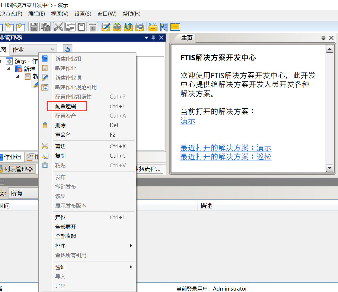 在FTIS 解决方案开发中心->作业管理器内,选中作业项,右键配置逻辑。主工作区出现以所选作业名命名的逻辑编辑器选项卡,如图: