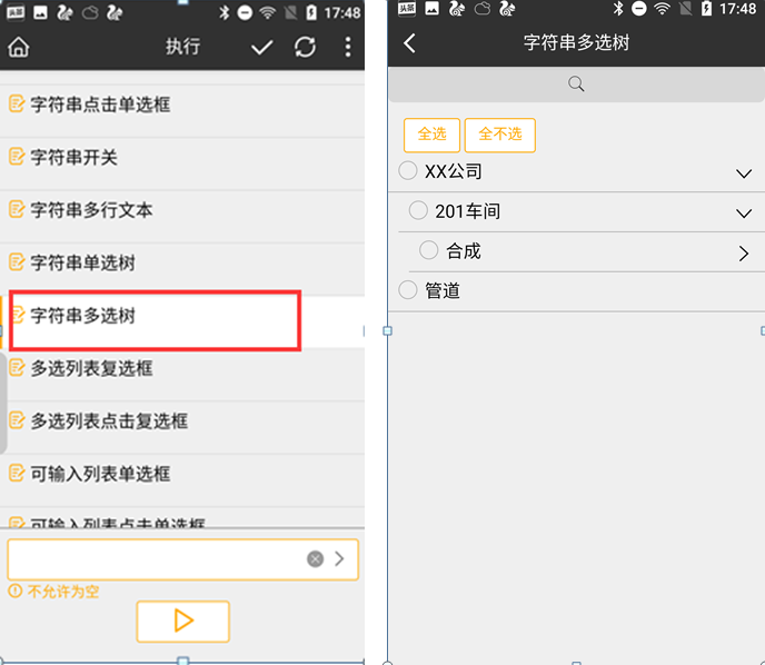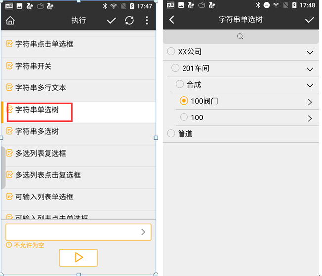 单选树建议使用在资产,组织单元等树状的结构的情况字符串多选树