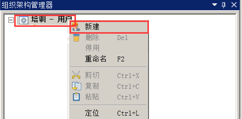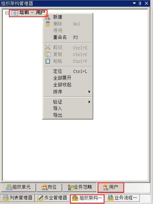 在导航栏→组织架构管理器→用户内右键当前应用-用户,在快捷菜单中即可完成用户的新建、删除、重命名、剪切、复制、粘贴、全部展开、全部收起、排序、验证、导入和导出操作。