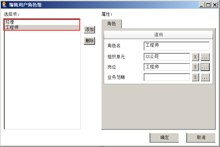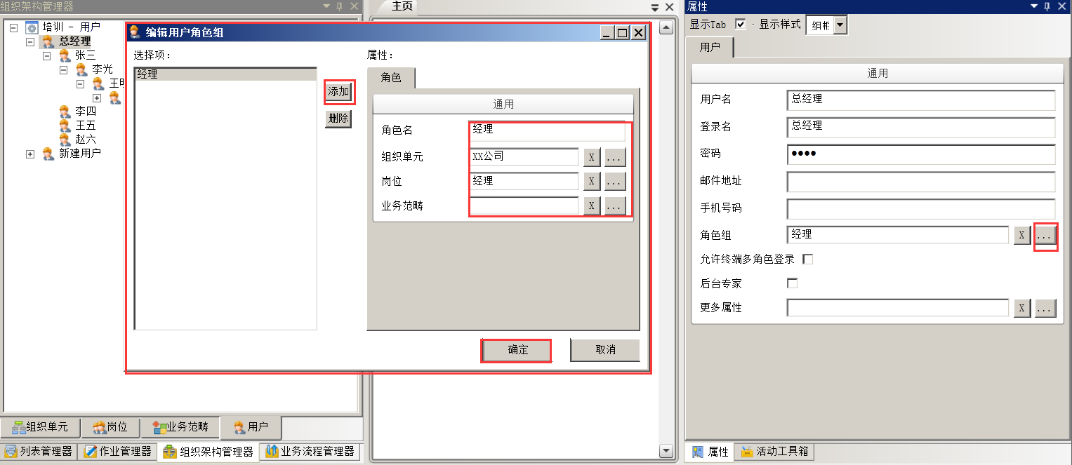 添加角色组,选择右侧导航按钮,编辑用户角色组,点击添加,为该用户新添一个角色组,配置相应的角色名,组织单元,岗位以及业务范畴,如图配置: