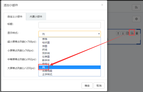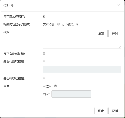 • 列中可以增加行,行中可以添加列;增加行列标题显示样式和位置。如图所示,首先添加一行,勾选上添加标题栏后,可选择文本格式或html格式,html格式有默认样例可供选择修改。