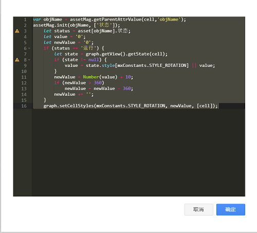 • 配置资产状态画面,在画面2中点开脚本参考,需要修改资产名称和相对应的资产属性名,拿到资产的状态,之后可以通过配置来获取相应数据并决定显示的样式以代表不同的状态,也可以配置不同状态下的颜色显示。