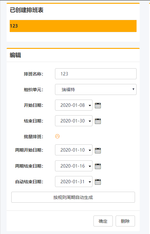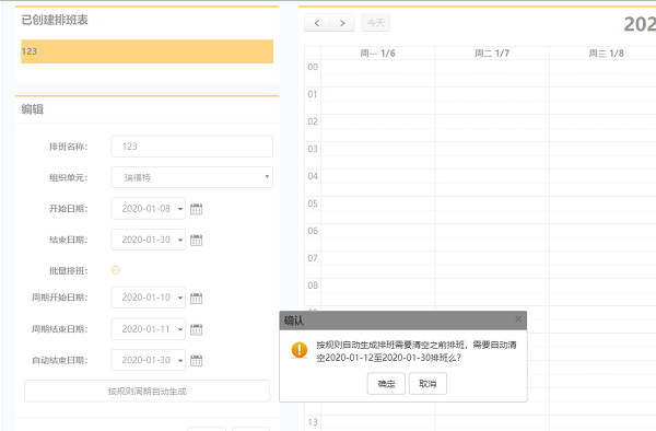 • 首先需要手动创建一个排班表,进行排班,以此为基础进行自动排班,点击按照规则周期自动生成。 每次会有确认提示,确定则清空周期结束时间后一天开始的周期自动排班,然后生成新的周期自动排班,点击取消则保留之前的自动排班并加上新的自动周期排班。