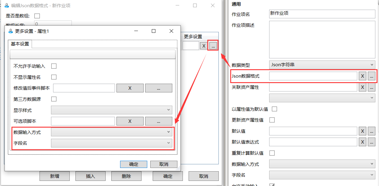 • 作业组属性和作业项的数据类型为json字符串时,其中的每个属性都有更多设置栏。
