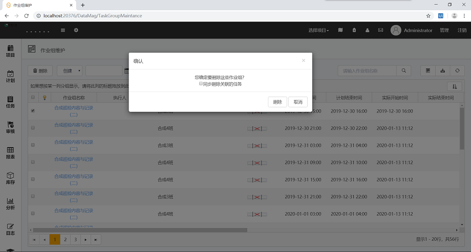 • 在作业组维护中,删除作业组时,会弹出窗口,可勾选同时删除作业组所关联的任务,不勾选则只删除该作业组。