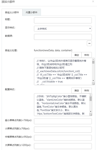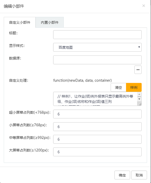 • 增加百度地图Widget;增加之字文字显示块Widget。 如图,增加了百度地图,可以选择数据源,自定义处理中有默认样例可供修改。