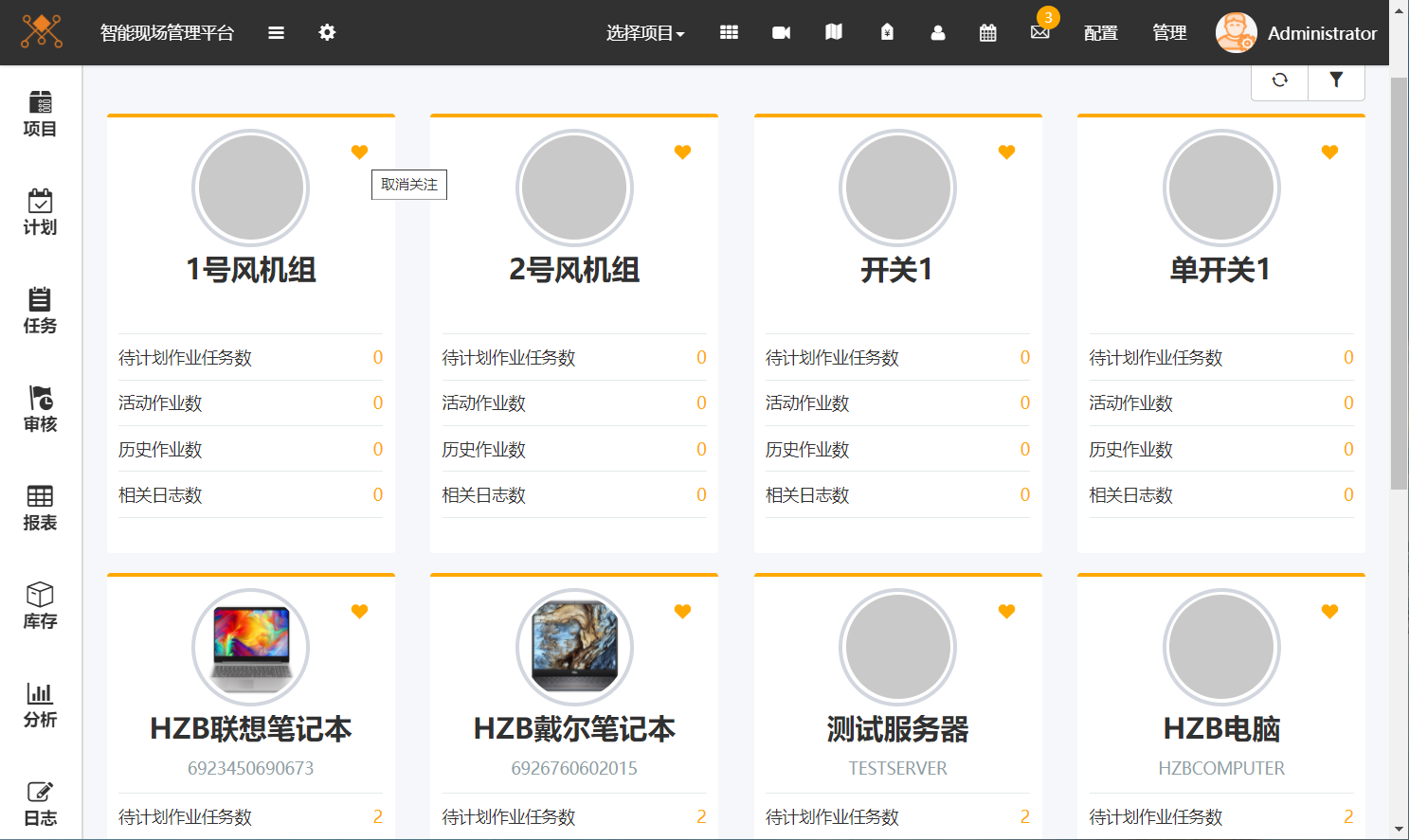 在资产总览视图和资产视图,支持对资产关注和取消关注。对于资产总览视图初始将显示当前登录用户关注的所有资产。如下: