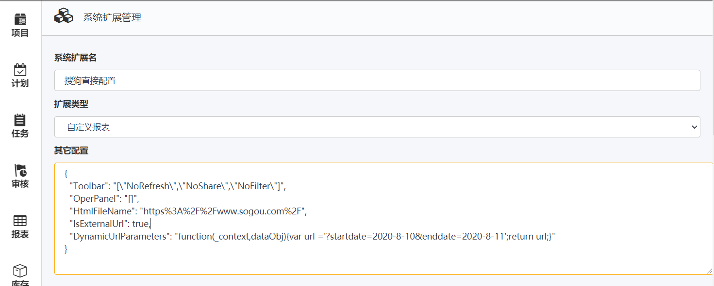 在配置自定义报表时,可以配置直接访问外部URL,通过“DynamicUrlParameters”参数可以增加动态地址参数。如以下的配置: