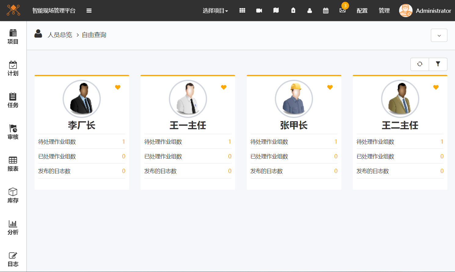 在人员总览视图和人员视图,支持对人员关注和取消关注。对于人员总览视图初始将显示当前登录用户关注的所有人员。如下:
