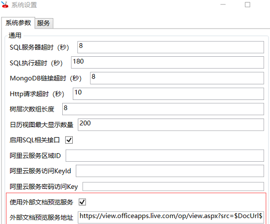 在系统参数中添加了使用外部文档服务选项,勾选上,地址栏中填写'第三方服务地址=$DocUrl$',$DocUrl$在最终访问时会替换成访问文档的地址,比如: