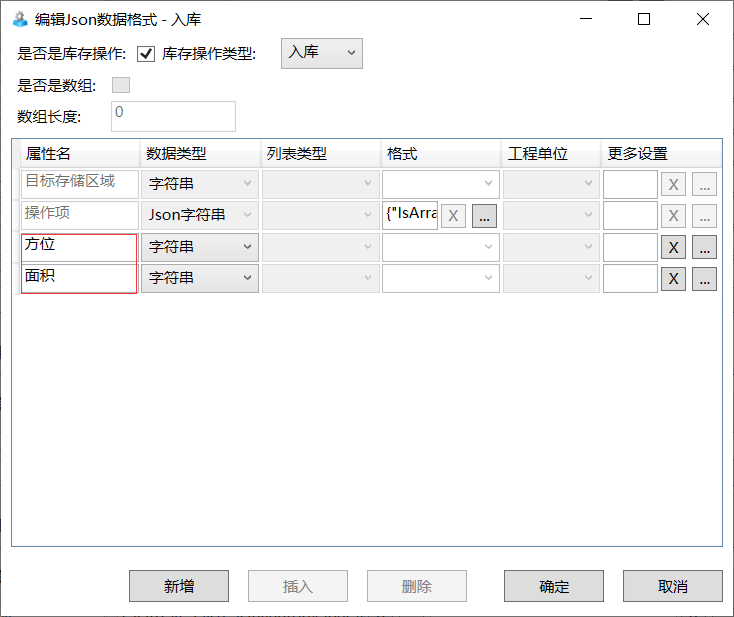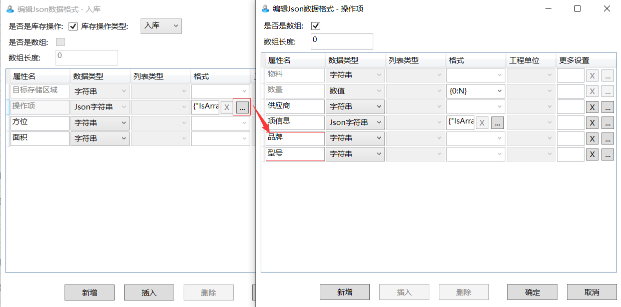 在SDC中新建编辑作业组属性Json数据格式的库存操作时,点击新增,要在存储区域和物料的同层级中新建(如图所示),名称要与EOC端自定义的属性名称一致。新建字段的数据类型,只支持没有任何显示样式的字符串