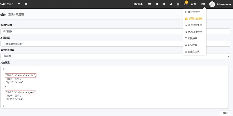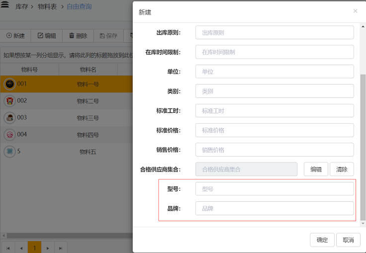 新建字段对应存储区域表和物料表中自定义的属性,需要在EOC端管理中的系统扩展管理里,添加内置报表自定义列,报表选择存储区域表或物料表,点击样例,修改其中"Field"的值为图中所示,其中"aaa"和"bbb"不可以同名,只为区分没有实际意义,可填写任意英文名称。属性名称"品牌"和"型号"可自行修改,也可以按照格式写上更多的属性。之后点击添加,进入库存的物料表,点击新建或编辑,就能看到多出来型号及品牌两个属性了
