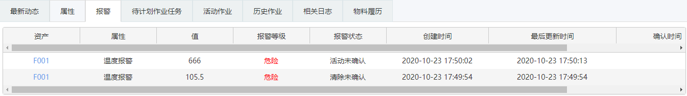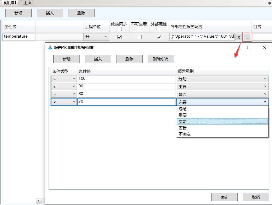 资产增加报警功能,资产属性中的外部属性可以配置报警,配置好条件类型、条件值和报警级别,当获取的外部属性值满足条件后,可以触发相应的报警级别