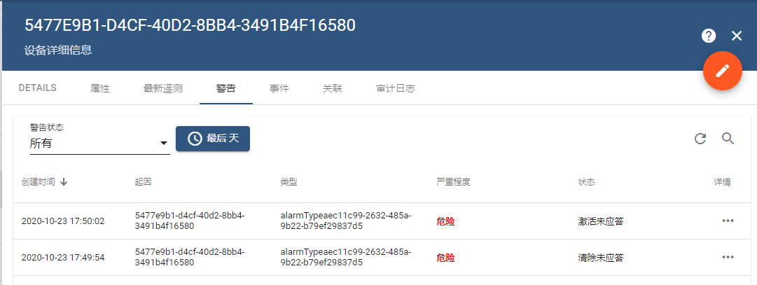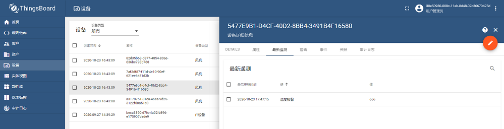 配置完成后,会在Thingsboard中自动创建报警功能的规则链,随着遥测数据的变化,达到报警条件值后,会触发相应的报警提醒,可以通过在EOC端和终端上修改值来触发报警了解关于报警的一些信息