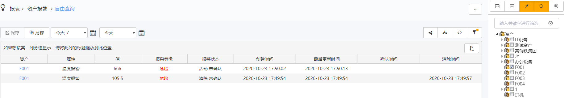 如果子项模板关联了资产,则填写的分组显示于资产下,子项模板显示于对应分组下,没有填写分组则会在资产下的无组名中。如果子项模板没有关联资产,则分组显示于资产树视图下方无关联资产中