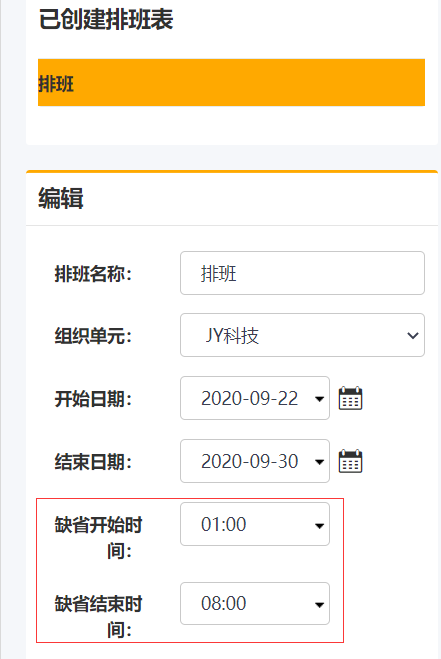 EOC人员自由排班功能增强,添加了缺省开始时间和缺省结束时间,每次新建排班人员时都按此缺省时段,可以修改