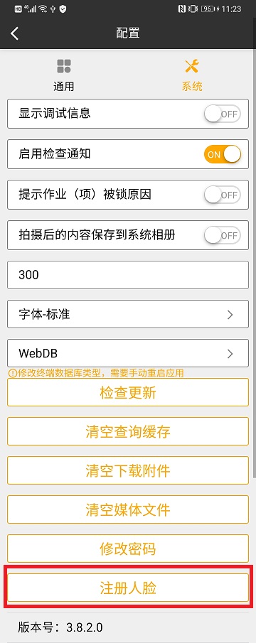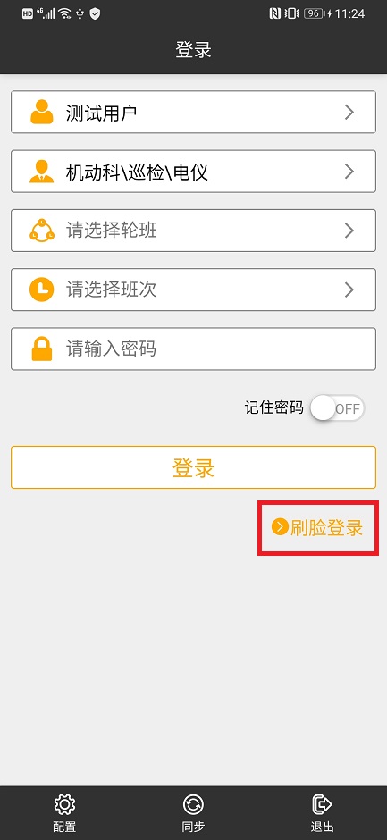 要使用此功能,首先需要安装人脸识别版本的apk,安装完成打开应用完成配置和同步,第一次要用密码登录,之后在配置中完成注册才可以。