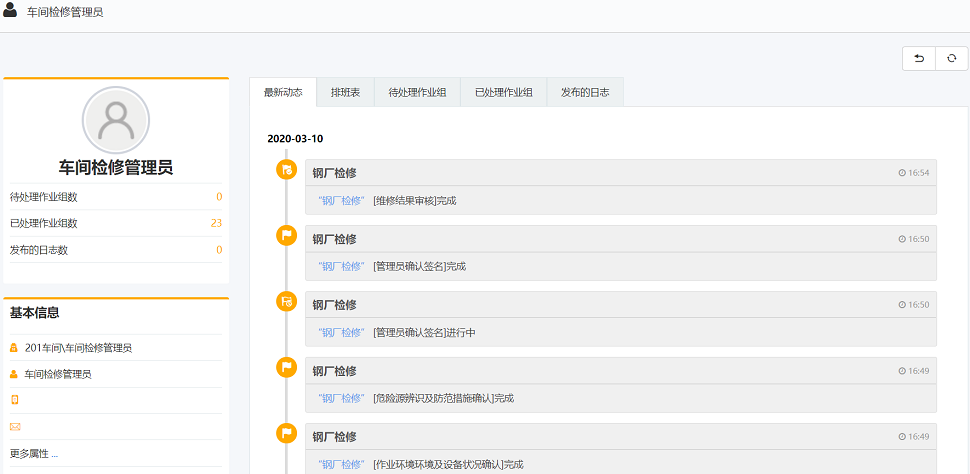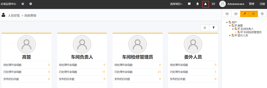人员总览列出了人员相关的总览信息,通过筛选器选择用户让其显示在页面上后,可以看到该用户当前待处理作业组数、已处理作业组数和发布的日志数的简单信息,点击即可进入该用户总览信息页面。