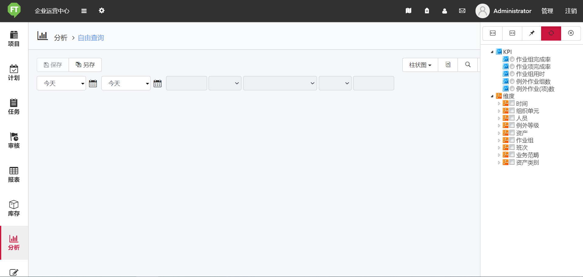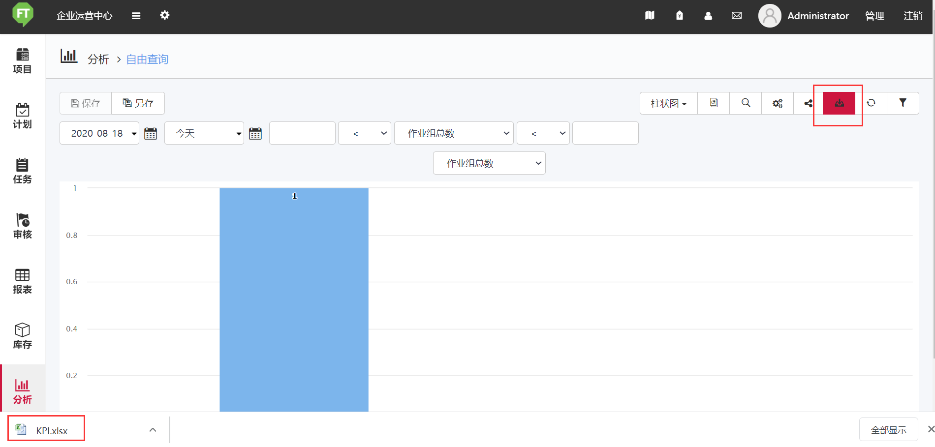 对于所有的归档作业组的数据,FTIS企业运营中心的分析模块进行基于关键绩效指标(KPI)的多维度绩效评估,并将评估结果以列表、柱图、饼图、趋势图等形象化的视图呈现给用户。分析页面右侧为筛选器,允许用户根据不同的KPI指标进行数据分析,以在中间KPI分析视图中列出需要的图表,允许用户保存针对KPI分析的查询,并提供给团队和个人使用,这类似于报表模块中的团队和个人查询。