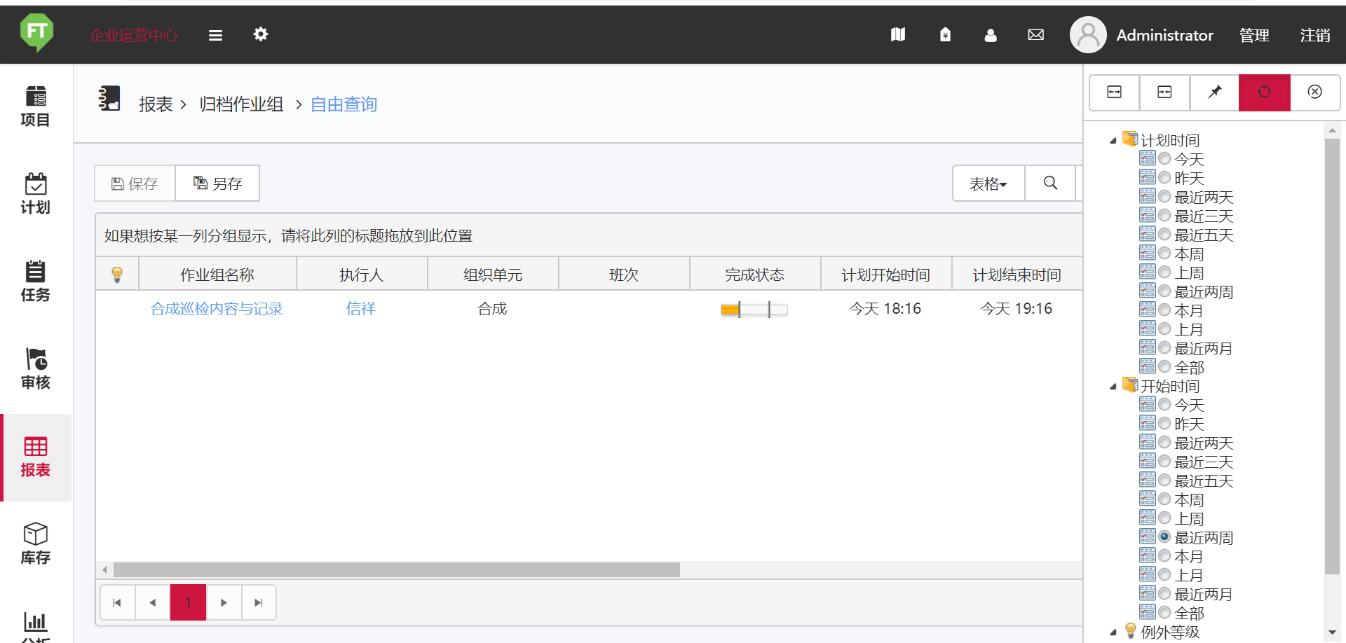 - 我的作业组列出了所有当前登录用户参与过活动的作业组,其筛选器预设四种查询的筛选条件,分别为:归档状态、我的作业、计划时间、开始时间、例外等级,中间我的作业组视图设有自定义查询功能,允许用户自定义过滤规则,还可以将查询出的报表导出至Excel。