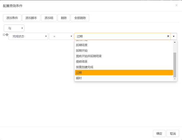 在配置查询条件窗口点击“添加条件”,针对查询条件,允许用户对一些特定字段作为条件进行查询。选择其中一项“完成状态”,如图: