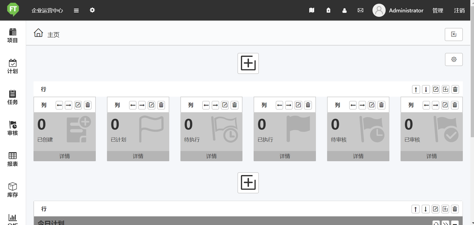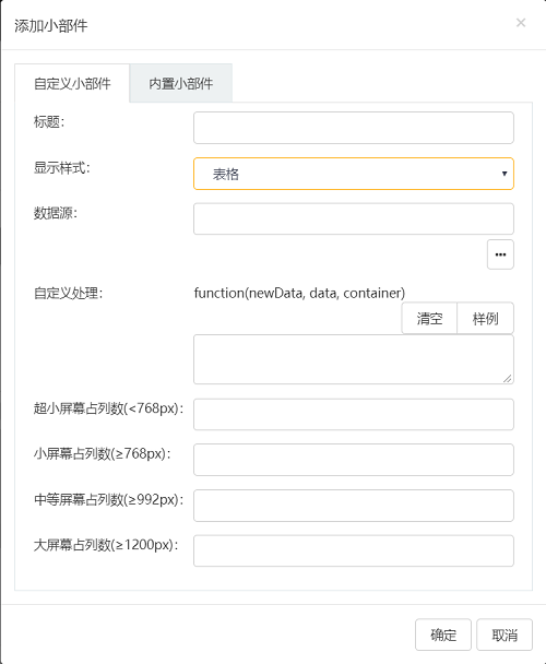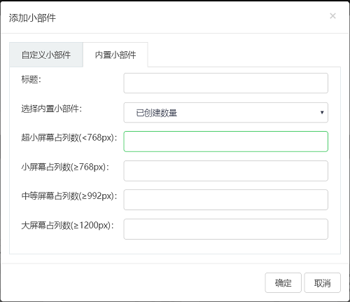 在行中,可以进行上移、下移、编辑行、添加小部件和删除的操作。上下移可以改变此行在主页中显示的位置,编辑行会弹出添加行时的窗口用以修改行设置,添加小部件分为自定义小部件和内置小部件,可以在此行中添加各类列数为1-12整数的小部件,在自定义小部件中除了列之外,都提供默认样例,点击样例即可,可自由修改,行列之间可无限添加。