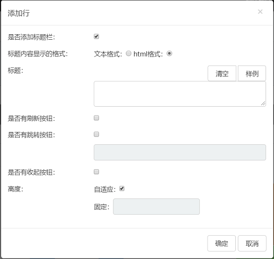 进入编辑模式后,点击主页当中的“田”字样按钮,即可添加行,勾选上添加标题栏后,可选择文本格式或html格式,html格式有默认样例可供选择修改。