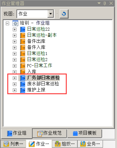 添加三个作业组,分别为厂务部日常巡检,废水部日常巡检,维修上报,如图