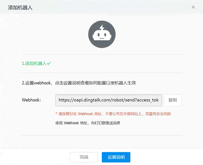 添加机器人后,根据业务需求选择对应的“安全设置”,并点击“完成”